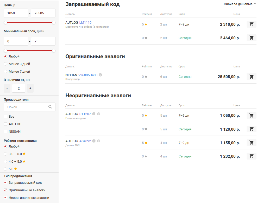 Если по Вашему запросу найдутся детали нескольких производителей, Вы сможете просмотреть предложения каждого из них (Рис. 2).