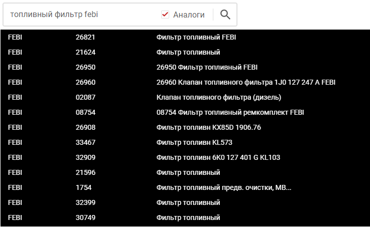 Для поиска детали по наименованию просто начните вводить название детали в строке поиска. Система предложит Вам варианты подходящих запчастей. Для поиска предложений по интересующей запчасти выберите её из списка - система произведет поиск и отобразит доступные предложения. Для отображения полного списка деталей нажмите кнопку поиска (Рис. 6).